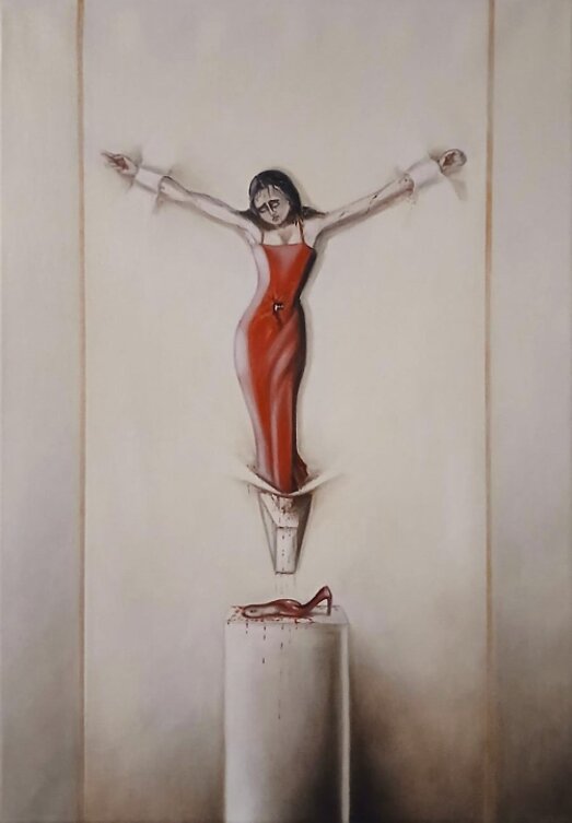 QUEST'OPERA NON È UNA RAPPRESENTAZIONE SACRA, MA UNA CRONACA DRAMMATICA E CRUDA DELLA REALTÀ. UNA DONNA È BLOCCATA CONTRO UN MURO CHE NON È UNA CROCE, MA UNA PRIGIONE DI INDIFFERENZA E VIOLENZA DOMESTICA. È LEGATA, PRIVATA DELLA SUA LIBERTÀ, IN UNA POSA DI ASSOLUTA IMPOTENZA CHE SQUARCIA IL SILENZIO.